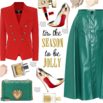 Holiday season-red blazer, green leather skirt, metallic pumps