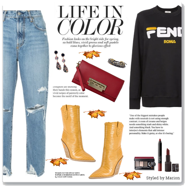 #fall #fallfashion #falllook #denim #boots #fendi #clutch #boyfriendjeans #makeup #earrings