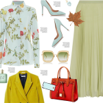 Fall Pastel- floral blouse, green skirt, pumps, coat