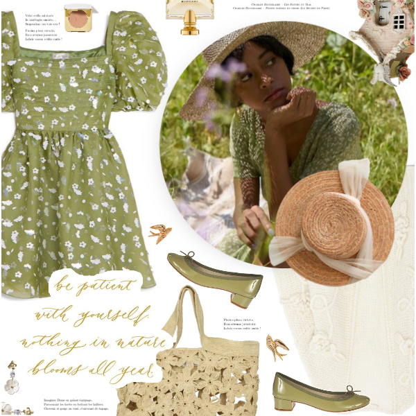 #floraldress #silkdress #minidress #floralcardigan #embroideredcardigan #snidel #floralraffiatote #blockheelpumps #strawhat #crystalfloralearrings #spring #cottagecore #nature #garden #look #outfit #cottage #bff #urstyle