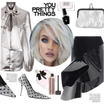 TexturePlay- metallic top, black leather-trimmed miniskirt by Saint Laurent, dot pumps Balenciaga