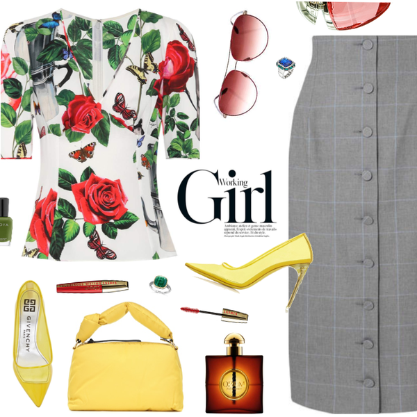 Dolce & Gabbana – Floral-printed silk top, grey skirt, yellow pumps