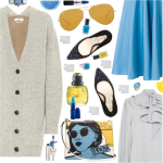 Cardigan, blue skirt, Prada Comic-print leather bag