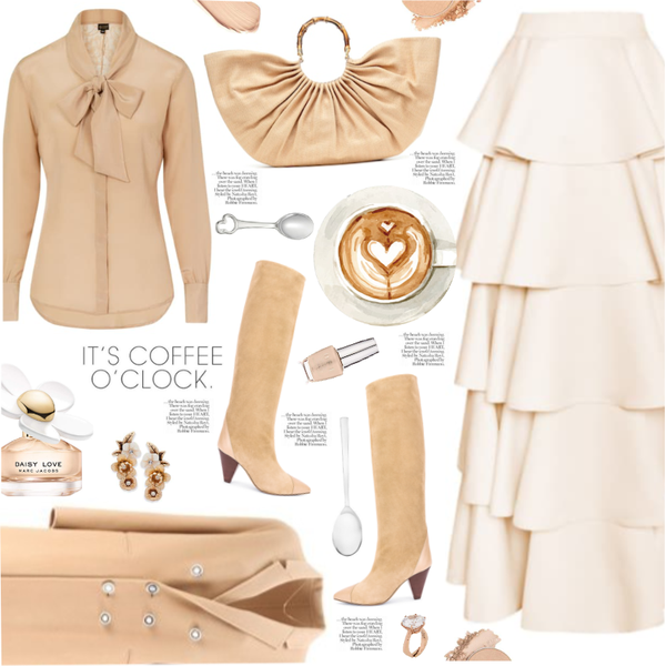 Peach monochrome-bow blouse, ruffle skirt, boots