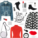 You are so Loved: Denim jacket, red sweater, heart skirt, boots