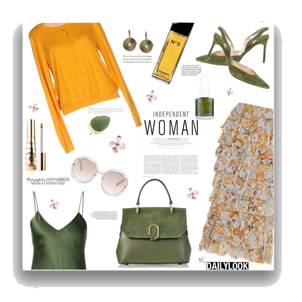 Fall Pastel- floral blouse, green skirt, pumps, coat