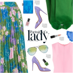 Floral Fall-floral skirt, pink top, green coat, lilac pumps
