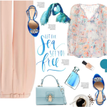 Velvet Jessa floral blouse; Peach pants, blue sandals