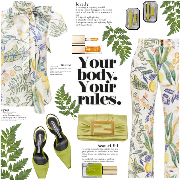 Silk satin mint green blouse, pants, D&G Floral Embellished Cross Body Bag