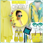 Dolce & Gabbana – Floral-printed silk top, grey skirt, yellow pumps